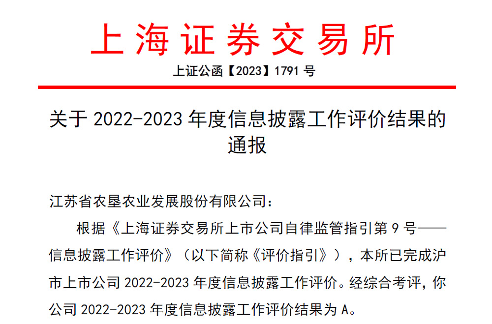 近日,上海證券交易所公布滬市主板上市公司2022-2023年度信息披露工作評價(jià)結果,蘇墾農發(fā)(股票代碼:601952)再次榮獲信息披露工作“A”級評價(jià)(最高級),這也是公司連續第四年獲此殊榮,充分體現了證券監管機構對公司法人治理、信息披露和投資者關(guān)系維護等方面工作的高度肯定。