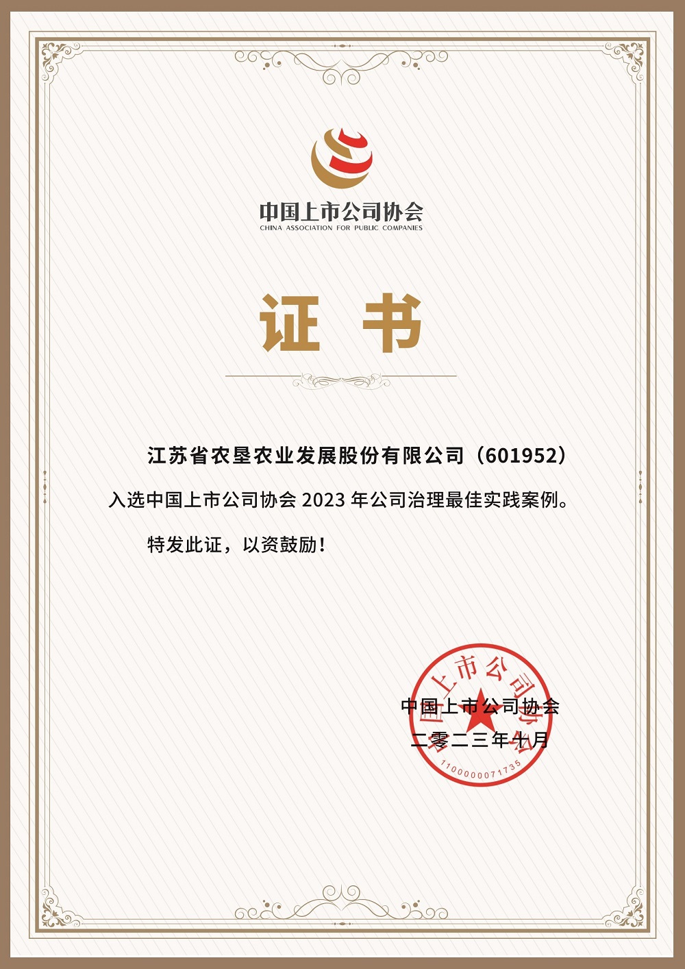 今年7月,中國上市公司協(xié)會(huì )分別開(kāi)展了“2023年公司治理最佳實(shí)踐案例評選活動(dòng)”和“2023年上市公司鄉村振興最佳實(shí)踐創(chuàng )建案例評選活動(dòng)”,由相關(guān)領(lǐng)域專(zhuān)家學(xué)者組成專(zhuān)家評審委員會(huì )對相關(guān)單位選送的實(shí)踐案例開(kāi)展嚴格遴選及多輪評審,最終評選出入選公司治理最佳實(shí)踐案例的上市公司100家,入選上市公司鄉村振興優(yōu)秀實(shí)踐案例的上市公司109家,兩項評選活動(dòng)蘇墾農發(fā)均成功入選。